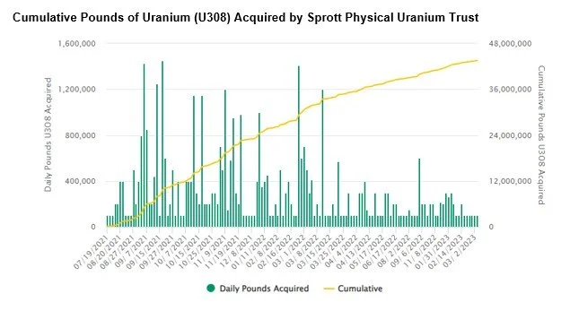 From late 2021 to mid-2022, SPUT was trading at a significant premium to NAV (and has fluctuated between premium and discount since), allowing it to issue additional shares and thus purchase a total of 43.5 mm pounds of physical uranium.