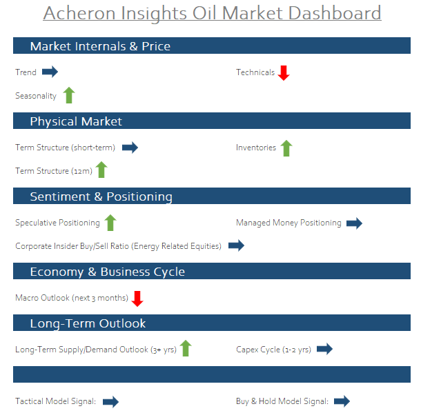 In terms of positioning, after April’s squeeze from their lowest net-position in years to being heavily long oil, money managers in the futures market have since been slowly unwinding their longs to reside in a relatively neutral state. Consisting of hedge funds and CTAs, these market participants are generally responsible for driving much of the trend in price, though at current levels do not provide any clear contrarian signal.