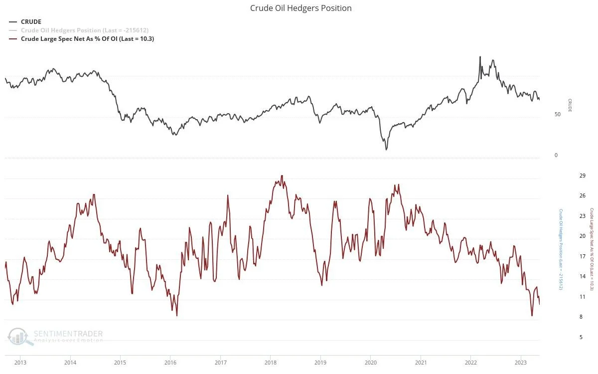 Meanwhile, overall speculative positioning remains near its lowest level in a decade. Though much less of a market timing tool when compared to the hedge fund or CTA component above, overall speculative positioning at such levels illustrates the upside potential for the market should the tide turn, while also suggest energy may be nearing a contrarian buying opportunity for those bullish long-term.