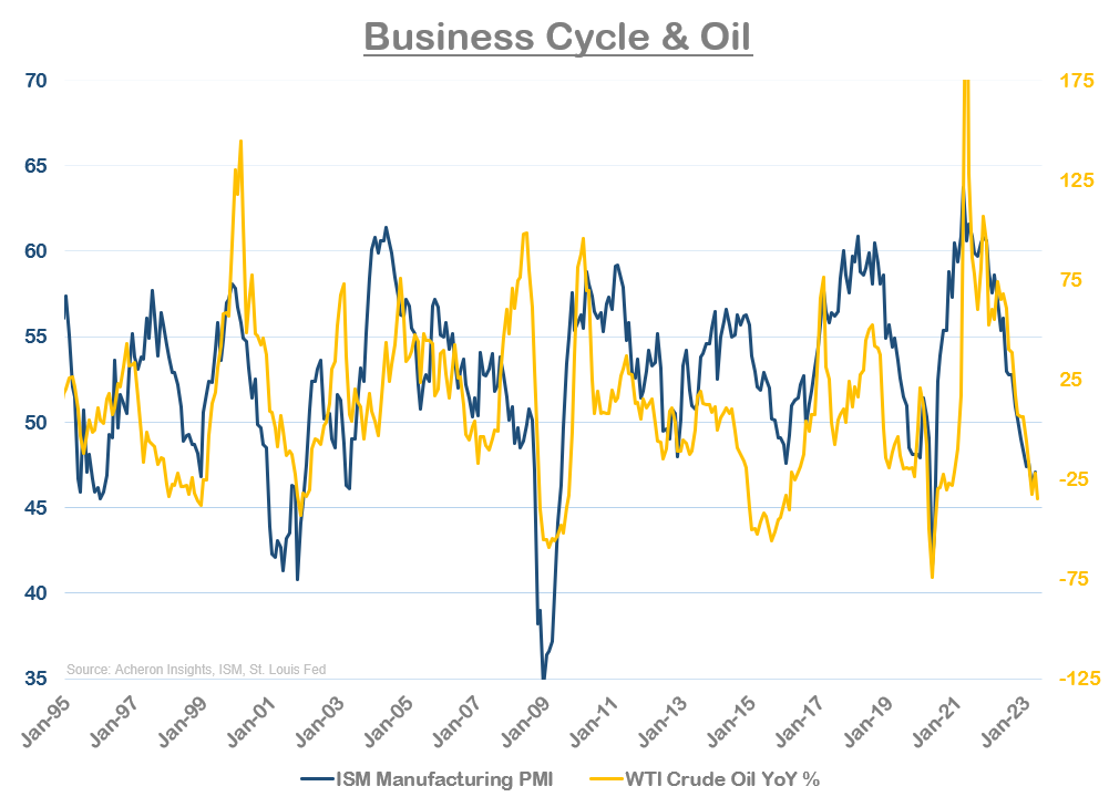 Turning to the macro outlook, traders have undoubtedly been expressing their bearish macro views through oil in recent times. Unsurprisingly, this dynamic in conjunction with the release of the SPR and China lockdowns among others have seen oil trade lower precisely in-line with the US manufacturing PMI, my preferred proxy for the business cycle. Given the outlook for the business cycle remains suspect at best for the remainder of 2023, the economic growth story is likely to remain a headwind for energy. Whether it can move higher in spite of such factors largely depends on whether the supply constraints will outweigh the potential demand destruction that may result from a growth slowdown, or potential recession.