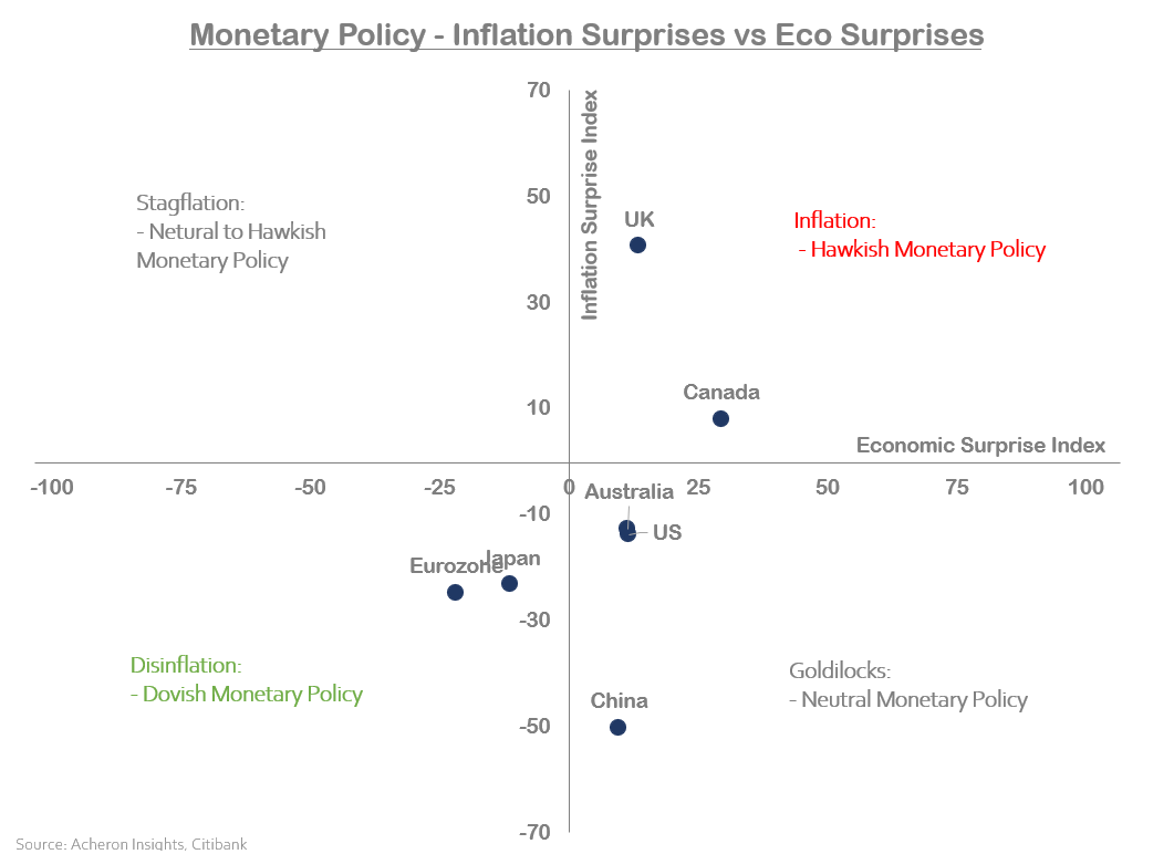 A similar message can be gleaned by assessing inflation and economic surprises for the US. As we can see below, although upside inflation surprises no longer look to be an issue for the US economy, we still need to see economic surprises move meaningfully lower before both suggest dovish monetary policy is on the cards.